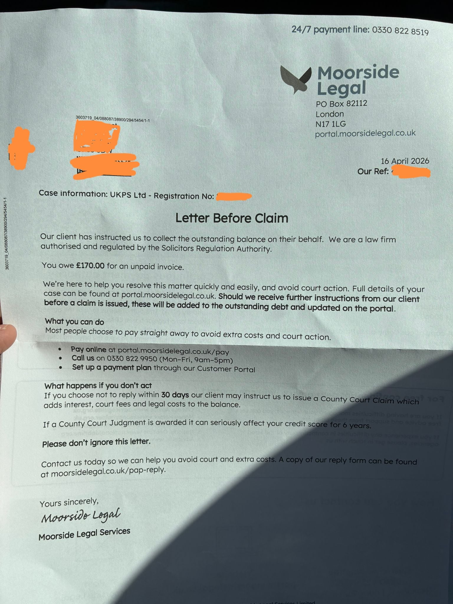 So I've received a "letter before claim" from moorside legal on behalf of ukps. An invoice for £170 dated 16/4/26.