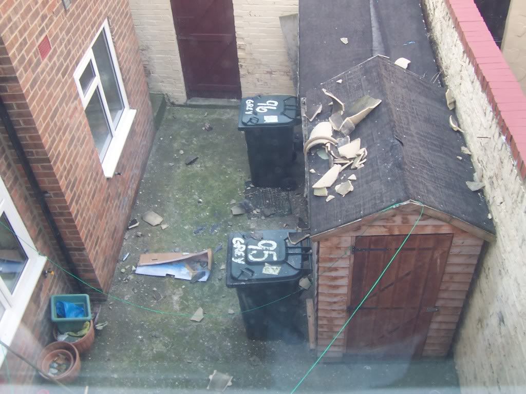 4 holes in rear part of roof, 3 upright beams cracked, one vertical beam (what i beleive to be a main support) is badly cracked, rear flat roof is damaged (will explain more of this in a bit), front wall / gate is wrecked, door step tiles are smashed, rubble in front & rear yard.