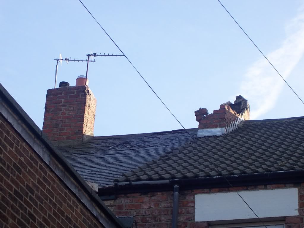 Last Friday, when it was very windy, the chimney belonging to next door (upstairs too) blew over. That wouldnt really trouble me, but it fell onto my roof, it wasnt just the pot, but the whole stack, it has caused alot of damage.