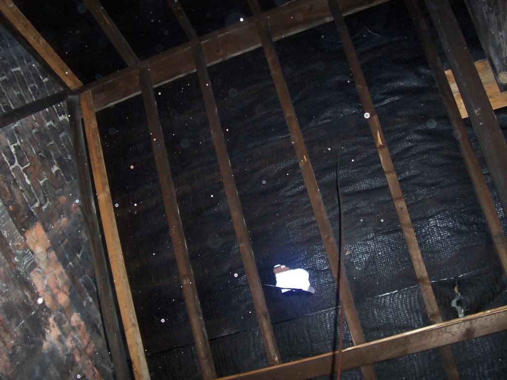 So, someone came out, put some sheeting over the holes in the roof, and over the flat roof. (can we go even further downhill from where we already are? looks like it!)