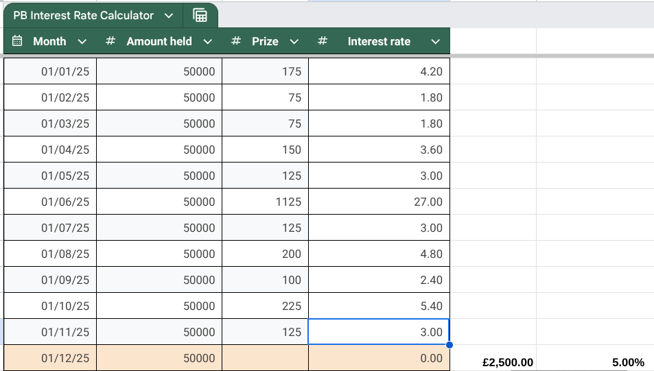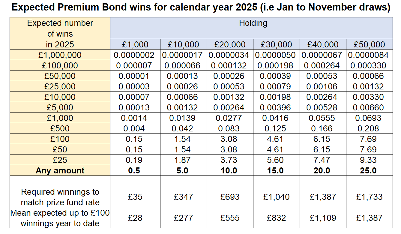 This table shows the expected total number of wins from the January to November 2025 draws (inclusive of both) if the holding has remained unchanged during the calendar year 2025. So on a 50K holding you could have expected on average about 7 or 8 £100 wins, 7 or 8 £50 wins and 9 £25 wins. And on a 50K holding you would have had about a 1 in 3.5 chance of winning at least one prize of £500 or above in the year to date.Required winnings to match the prize fund rate for the year to date on 50K holding are £1,733 (penultimate row of table). The £500 and above wins on a full 50K holding are going to be few and far between as the table shows. As we know this skews the median winning amount downwards. So I've shown the arithmetic mean winnings of £100 and below prizes also which is £1,387 for a 50K holding.I've won £0 on a £1,000 holding in 2025 so far. Last wins September 2024 (£100) and July 2024 (£100) while also holding £1,000.
