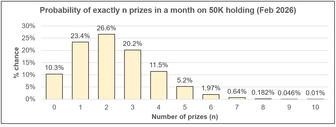 The probability of winning at least 6 prizes in the February 2026 draw is about 2.9%; it should happen about once every 3 years on current prize fund rate and distribution of prizes.