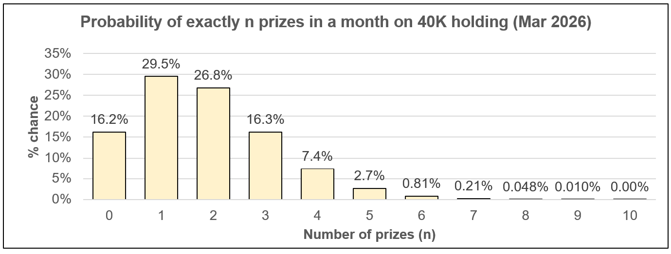 These are the odds of winning n prizes in a monthly draw on a £40,000 holding based on the 3.6% prize fund rate over that period